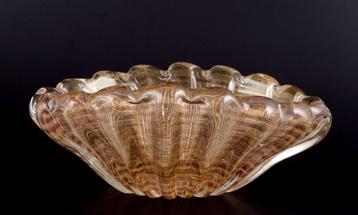 Murano, Italy. Large ribbed bowl in art glass. Clear glass with gold dust inlay. Organic shape. Approximately from the 1970s. Perfect condition. Dimensions: L 21.0 cm x D 17.0 cm x H 8.0 cm.