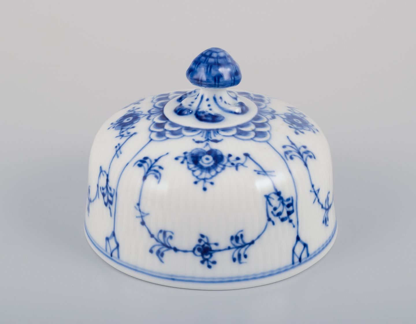 Royal Copenhagen Musselmalet Halvblonde, smørkrukke. Modelnummer: 1/502. Datering: 1969-1979 Stemplet. I perfekt stand. Anden sortering. Mål: D 17,0 cm. x H 9,0 cm.