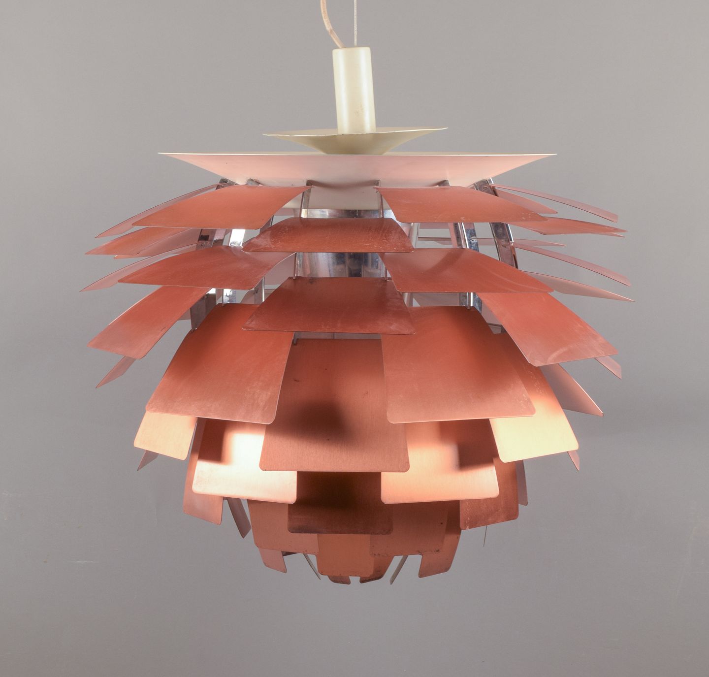 Poul Henningsen for Louis Poulsen. "Kogle" (PH Artichoke) pendant. Upper shade in matte white metal, blades in lacquered copper, suspension with integrated steel line. 72 blades.