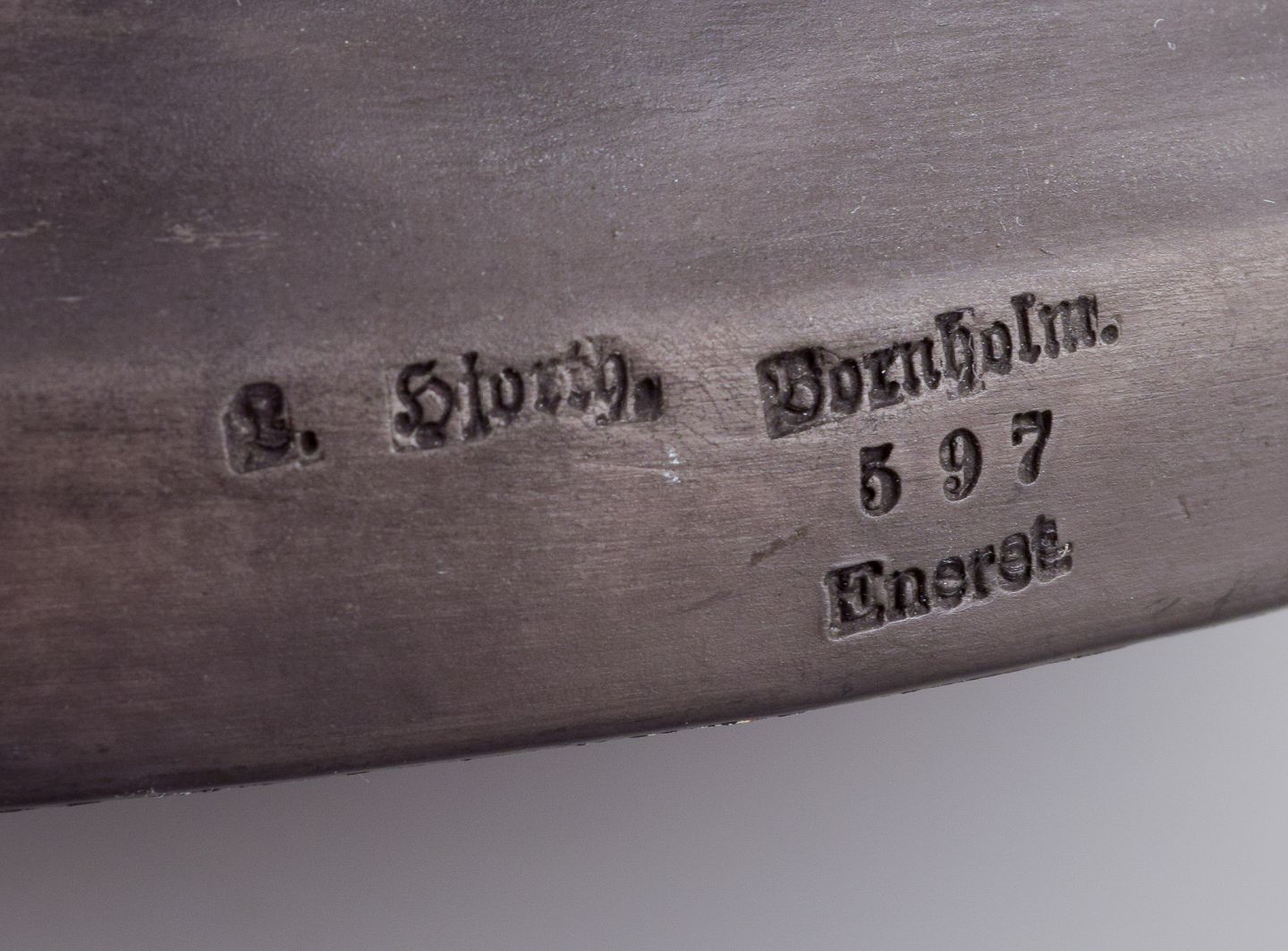 L. Hjorth, Bornholm. Figur af Jeanne d'Arc i sort terrakotta. Modelnummer 597. Ca. 1900. Stemplet. I flot stand. Mål: H 24,5 cm. x D 17,5 cm.