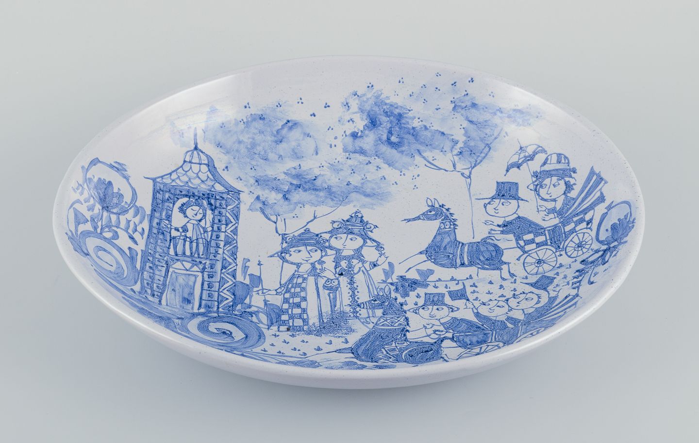 Large oval ceramic bowl hand-painted in blue. Motif of guests in a horse-drawn carriage on their way to a party at the castle.