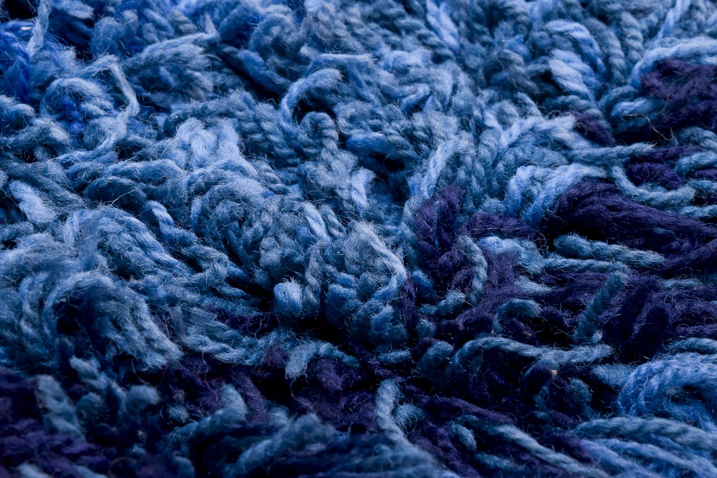 Skandinavisk tekstildesigner. Ryatæppe af bomuld. Håndknyttet. Abstrakt motiv. Blå farver. Ca. 1970’erne. Perfekt stand. Mål: L 128 cm. x B 81 cm.