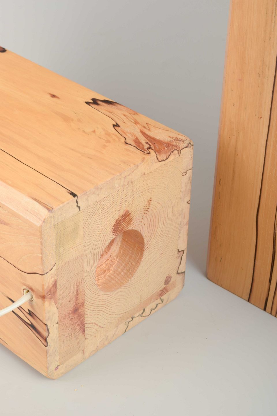 Organisk formet lampefod i massivt træ med markante åretegninger og naturligt spil i overfladen. En enkel cylindrisk fatning fuldender det rene, minimalistiske udtryk.