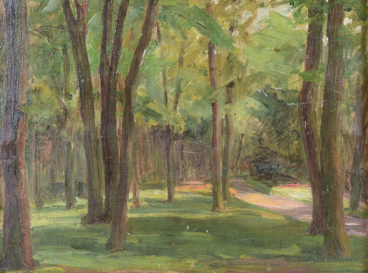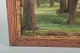 Et stemningsfuldt naturmotiv med en sti gennem en tætbevokset skov, malet i grønne og gyldne toner. Værket fanger lysets spil i løvtaget og skaber en rolig atmosfære, hvor naturens rytme træder tydeligt frem.