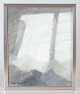 Et stemningsfuldt og afdæmpet maleri i grå og hvide nuancer, hvor geometriske og abstrakte former smelter sammen i en komposition, der både virker stringent og drømmende. Værket fremstår med et minimalistisk udtryk, hvor lysets spil i de hvide felter kontrasteres af de mørkere, skyggefulde partier.