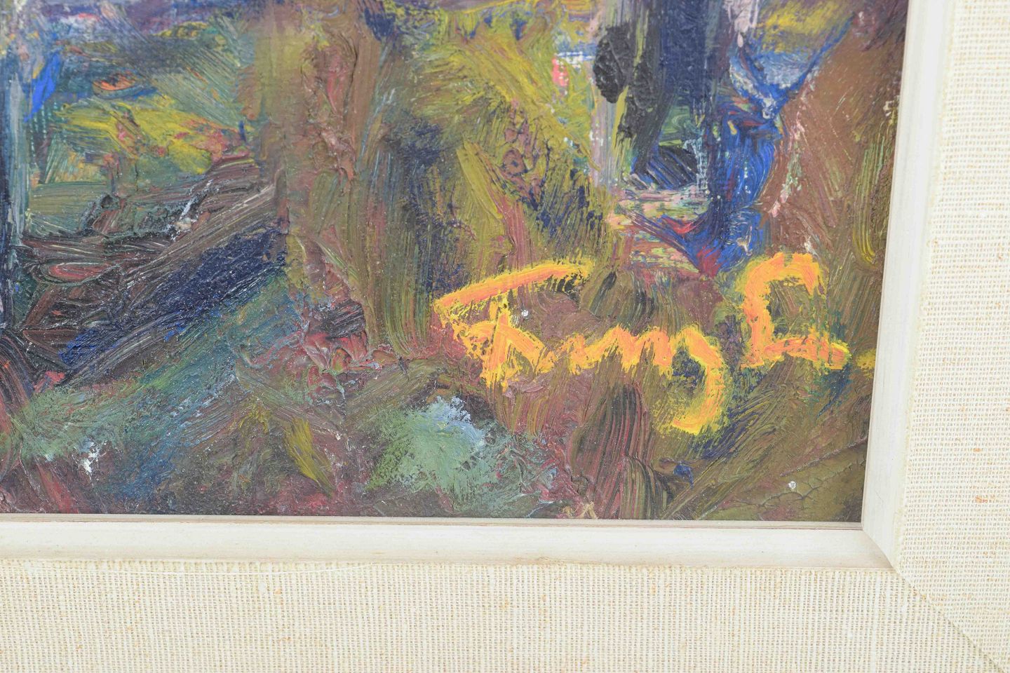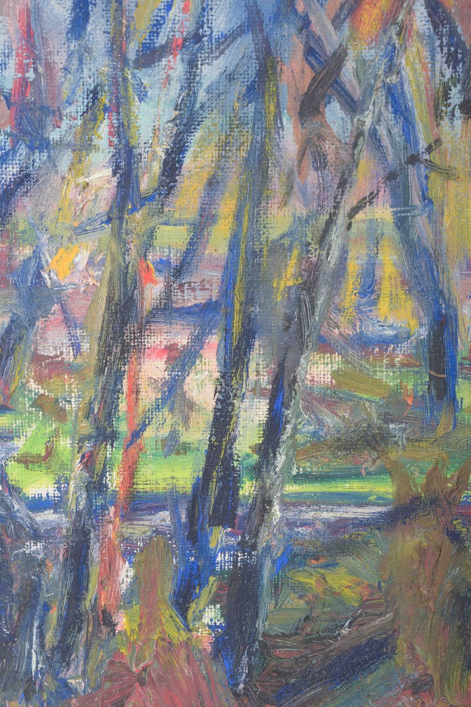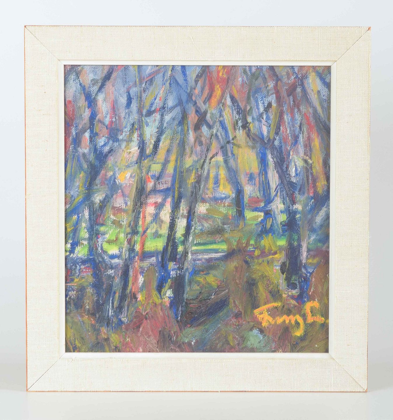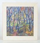 Et stemningsfuldt og farverigt værk, hvor de kraftige penselstrøg og de livlige farver skaber en næsten impressionistisk skildring af en skovscene. Gennem spillet mellem blå, grønne og jordagtige toner indfanges lysets skift og naturens energi på en ekspressiv måde.