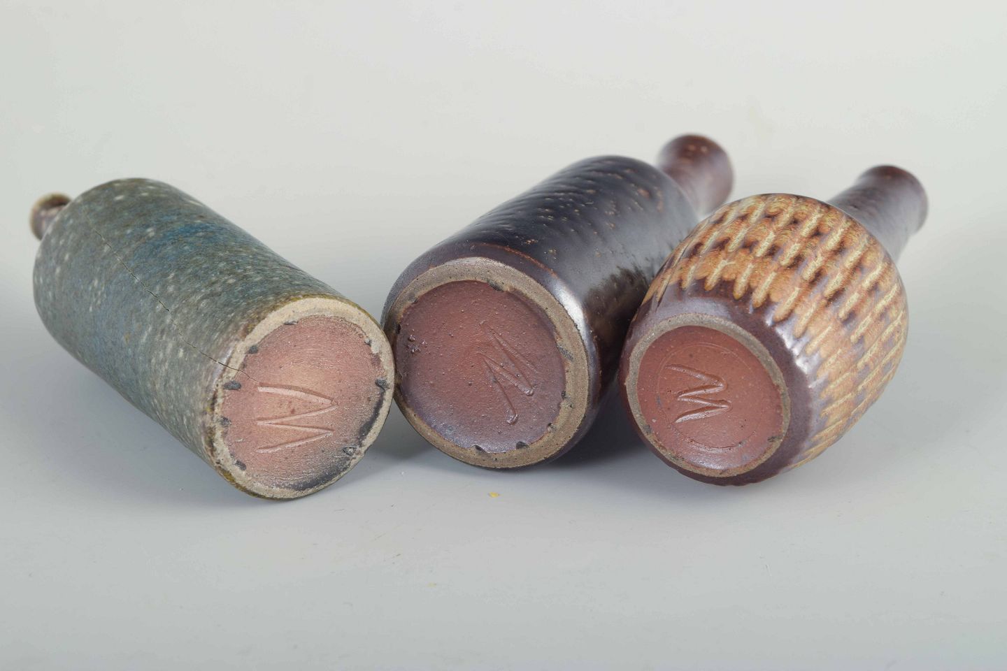 Organisk formede vaser i drejet stentøj med rå overflader og glasurer i brune, sorte og blå-grønne toner.