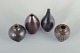 Organisk formede vaser i drejet stentøj med rå overflader og glasurer i brune, sorte og blå-grønne toner.