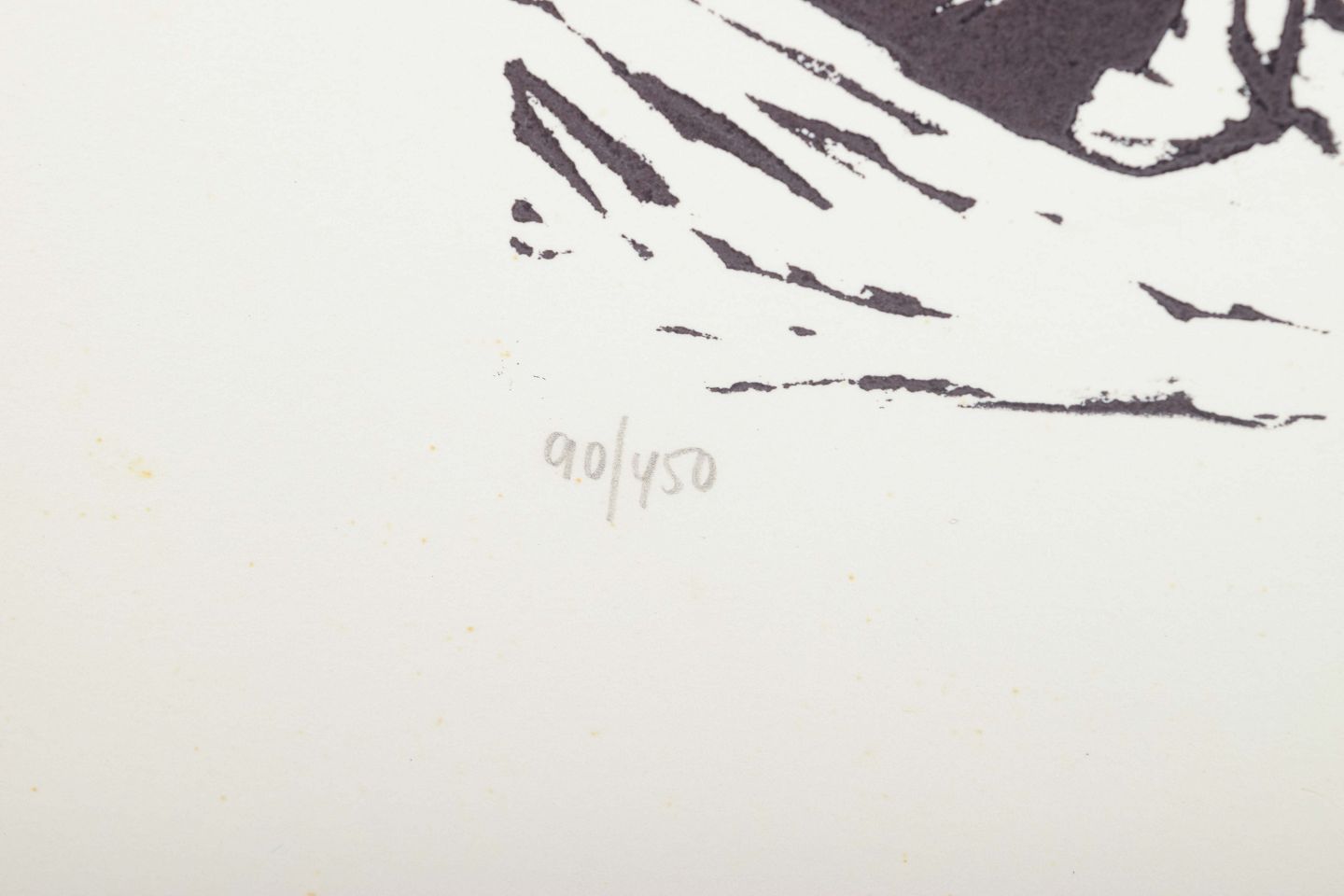 Sort-hvidt farvelitografi med motiv af en terrier-lignende hund, der sidder ved siden af ophængt jagtvildt. Motivet kombinerer naturalistiske detaljer med grafisk kontrast i en enkel, stiliseret komposition.