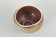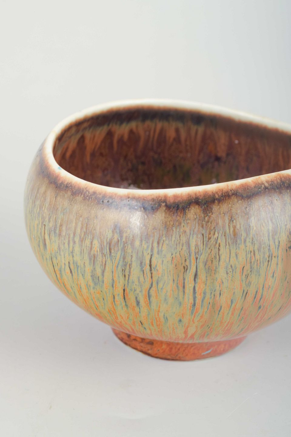 Organisk formet skål i drejet stentøj med flerfarvet glasur i grønne, rosa og brunlige nuancer.