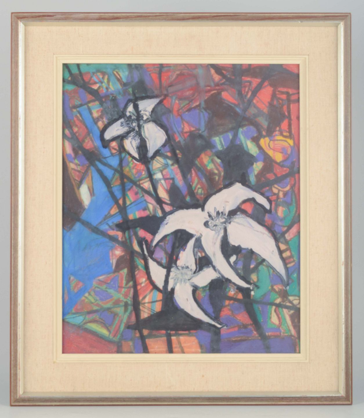 Et stemningsfuldt og dynamisk værk, hvor farver og former smelter sammen i en fri og ekspressiv komposition. De blandede teknikker giver billedfladen dybde og tekstur, og udtrykket bærer præg af tidens modernistiske eksperimenter.