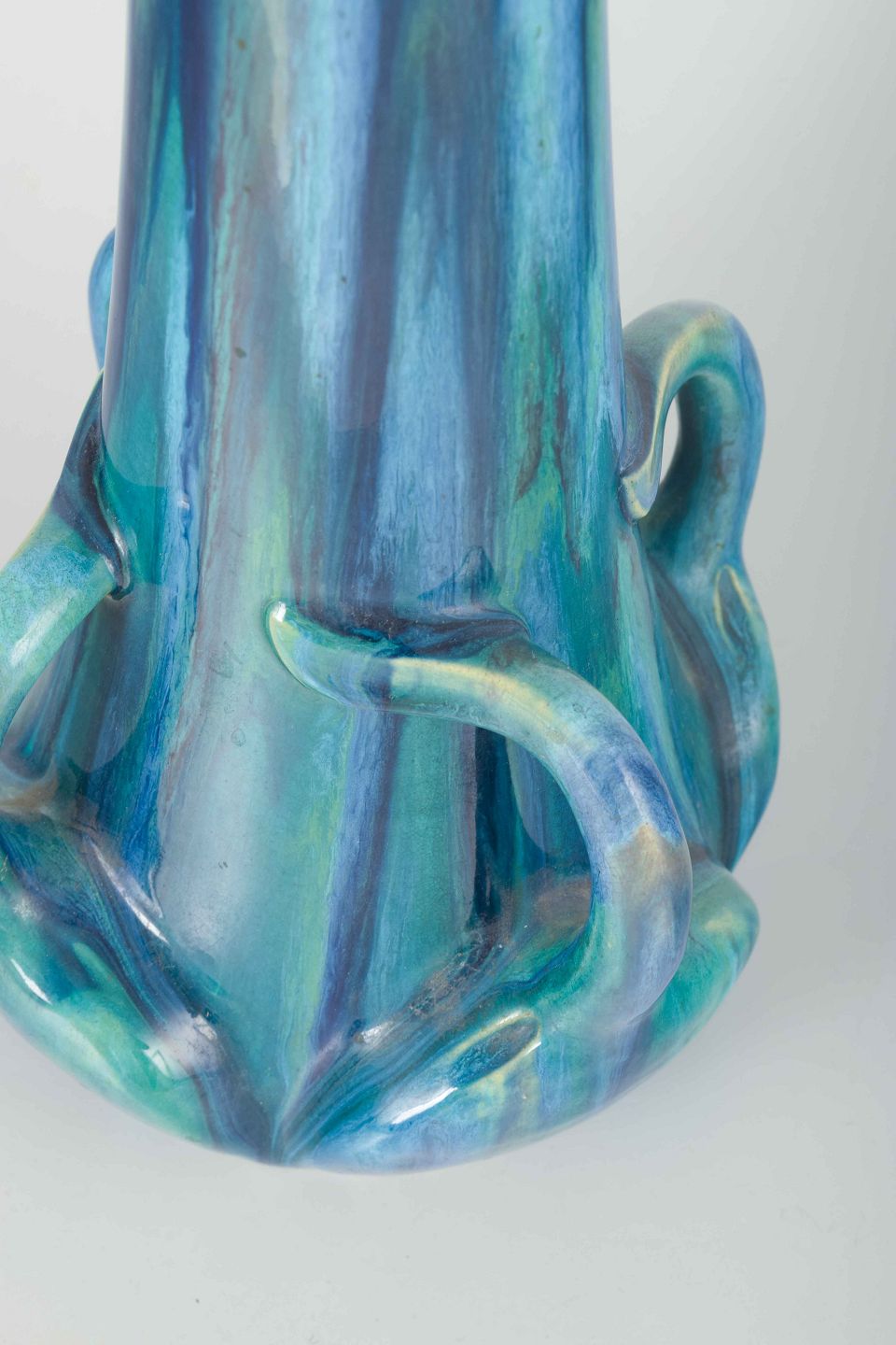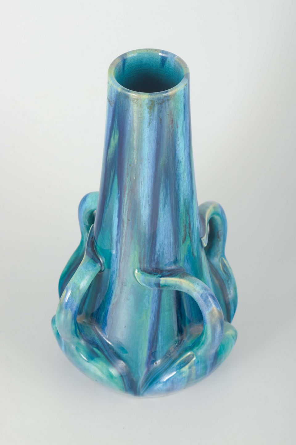 Organisk formet vase i stentøj med skulpturelle detaljer og flerfarvet glasur i blå og grønne nuancer. Typisk for Art Nouveau-periodens naturinspirerede formsprog.