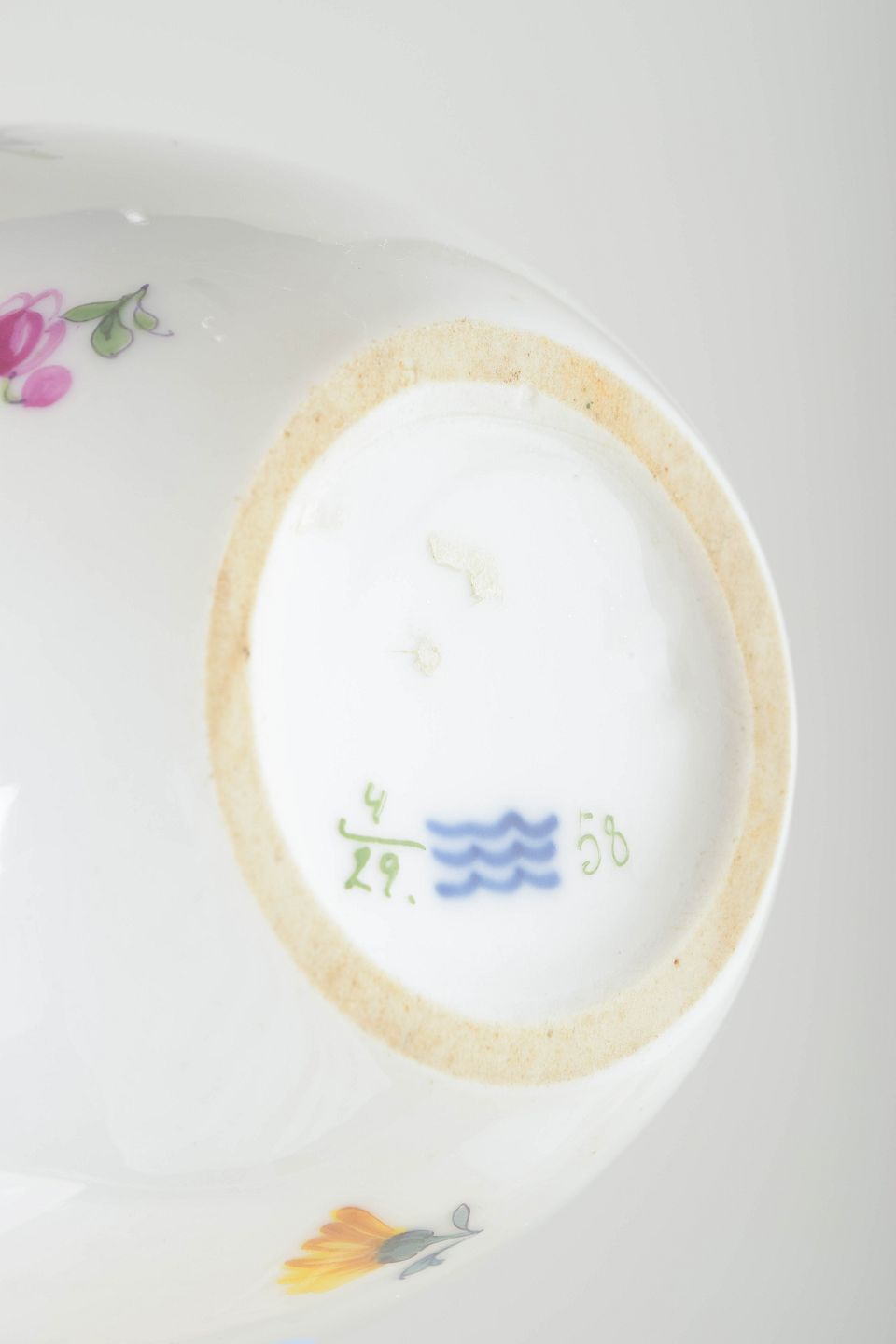 Royal Copenhagen blev grundlagt i 1775 under protektion af Dronning Juliane Marie og er verdenskendt for sit håndmalede porcelæn. “Sachsisk Blomst” blev introduceret i slutningen af 1700-tallet og inspireret af samtidens botaniske stik. Serien blev hurtigt en af fabrikkens mest populære dekorationer, og unikke former som lågkrukker med hank er blandt de sjældnere og mest eftertragtede samlerobjekter i dag.