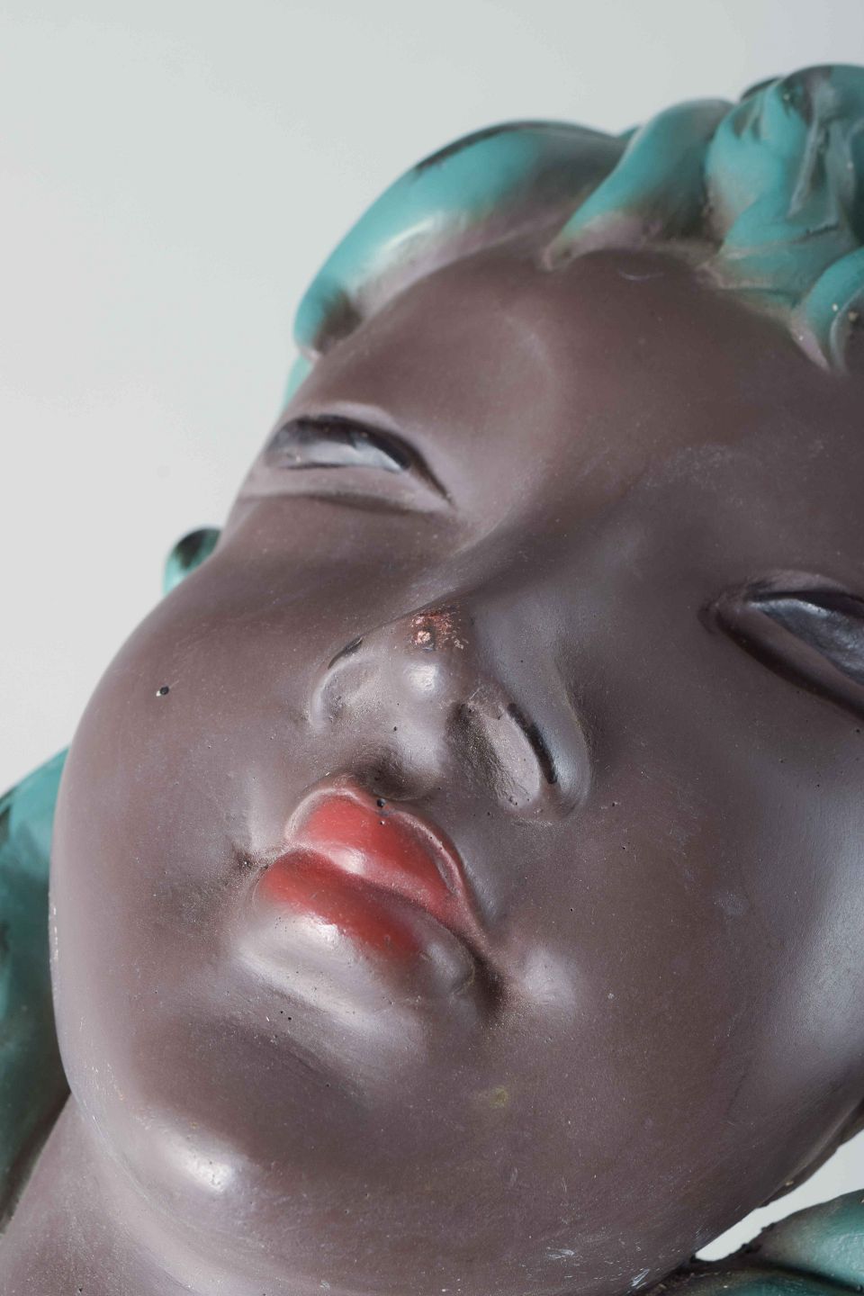 Dekorativ italiensk keramikbuste af kvindehoved med turkise og sorte hårtoner samt rødlig bluse. Udført i et karakteristisk stiliseret formsprog for perioden.