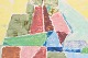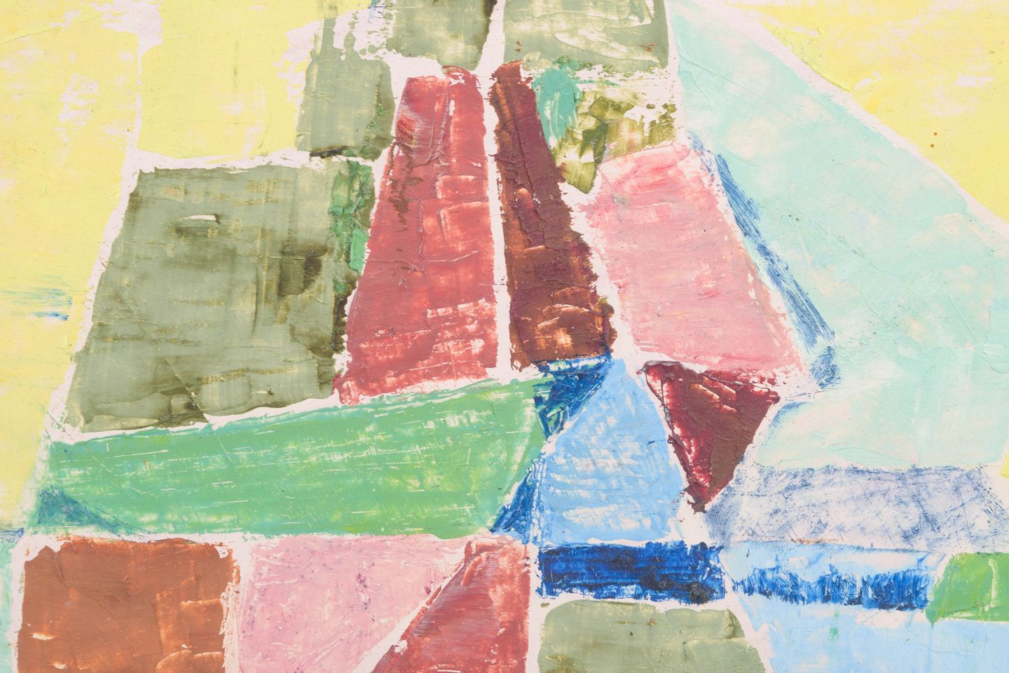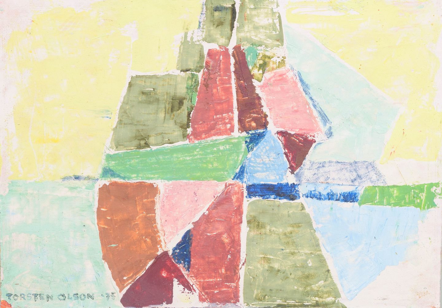 En lyrisk-abstrakt komposition opbygget af facetterede farvefelter i grønne, røde, blå og gule toner. Maleriet udstråler en rytmisk balance mellem struktur og opløsning — et vibrerende koloristisk felt, hvor motivet antydes snarere end beskrives. Typisk for Olsons modne fase i 1970’erne med indflydelse fra fransk lyrisk kubisme.