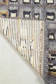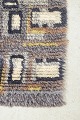Håndknyttet rya-tæppe i uld med geometrisk mønster i grå, creme, gul og sorte nuancer. Et grafisk og harmonisk design, typisk for skandinavisk tekstilkunst i perioden, hvor modernistiske principper blev oversat til dekorative, håndlavede tekstiler.