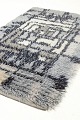 Håndknyttet rya-tæppe i uld med geometrisk mønster i sort, grå og cremefarvede toner. Et tidstypisk design med grafisk karakter og afbalanceret farvespil, som afspejler periodens modernistiske tilgang til tekstilkunst.