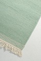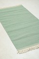 Håndvævet rölakan-tæppe i uld med ensfarvet væv i støvet grøn nuance og frynser i enderne. Et stilrent eksempel på svensk tekstiltradition, hvor enkelhed og håndværksmæssig kvalitet går hånd i hånd.