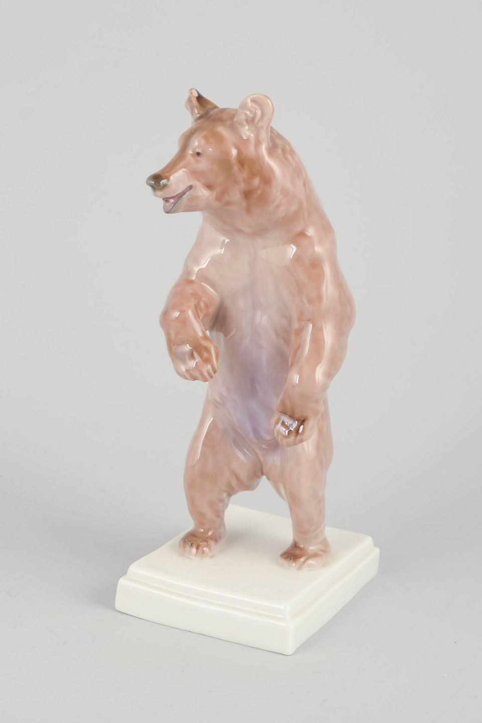 Porcelain figure of a standing brown bear in a natural posture, hand-painted in brownish tones with fine detailing and glossy glaze. Mounted on a rectangular base. 1st quality.