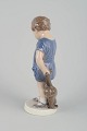 Porcelænsfigur af lille dreng i blå sparkedragt med en bamse ved siden af og en bold for fødderne. Fin og tidstypisk model i klassisk Royal Copenhagen-stil med bløde pastelfarver og naturlig fremstilling.