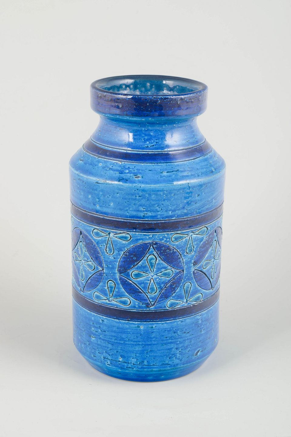 Høj cylindrisk vase i keramik med reliefdekoration og karakteristisk “Rimini Blu”-glasur i intense blå og turkise nuancer. Overfladen er håndglaseret med geometriske mønstre og brune bånd, der fremhæver seriens levende farvespil og tekstur. Et klassisk eksempel på Aldo Londis ikoniske formsprog for Bitossi.