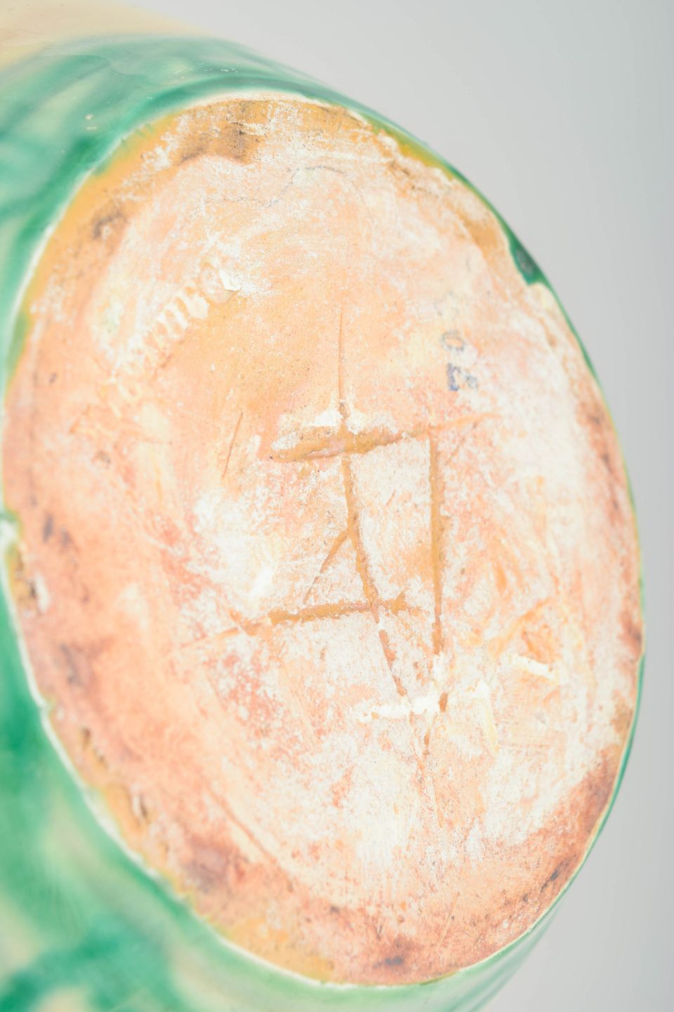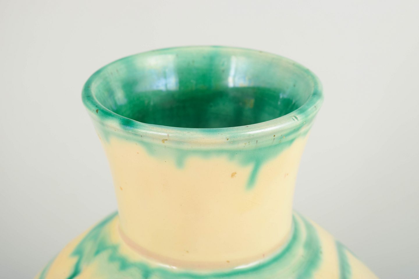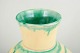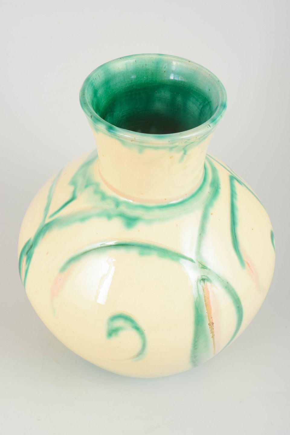 Hånddrejet keramikvase med klassisk pæreformet korpus og udsvajet hals. Dekoreret i en cremefarvet grundglasur med karakteristiske grønne penselstrøg i spiral- og drypbevægelser – et typisk udtryk for Kählers dekorative arbejde i mellemkrigstiden.
