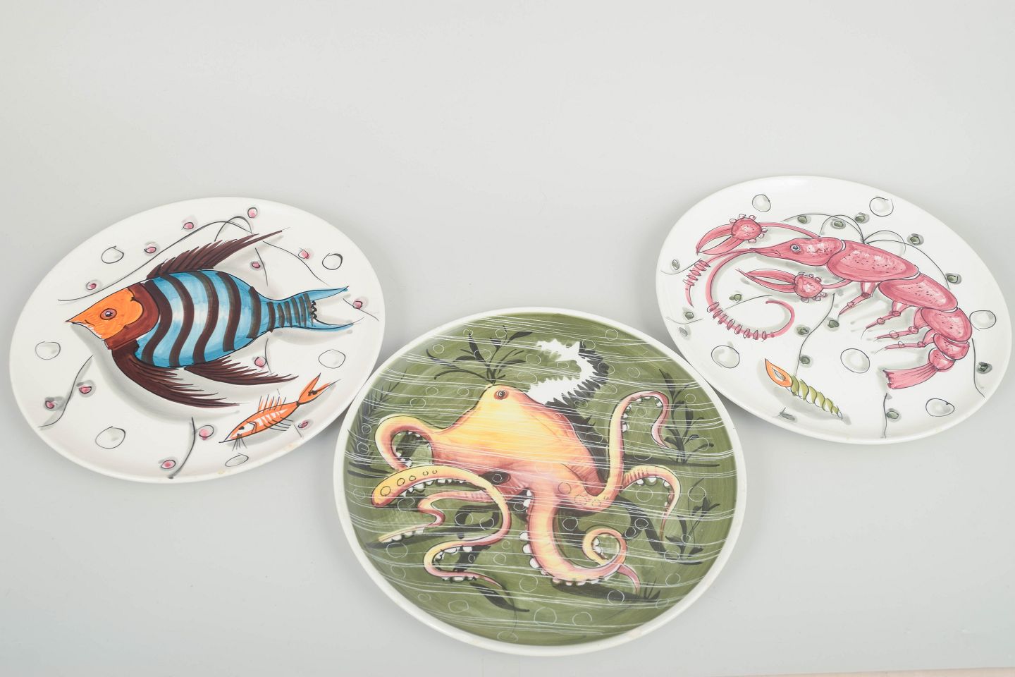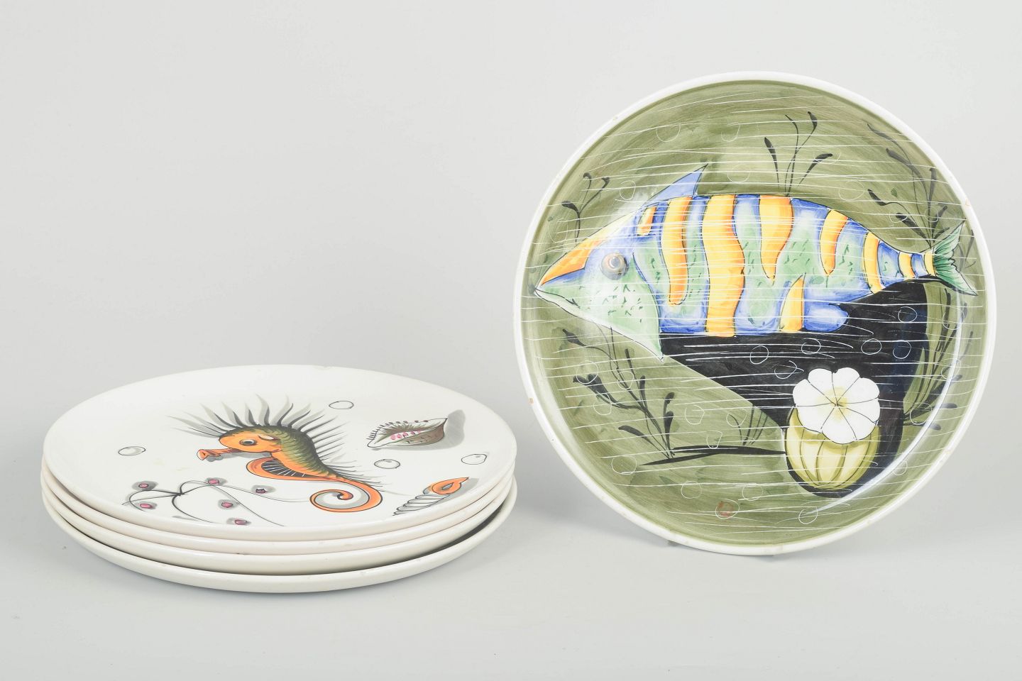 Sæt af fem hånddekorerede fajancetallerkener med farverigt motiv og klassisk italiensk formsprog. Enkelte små skår.