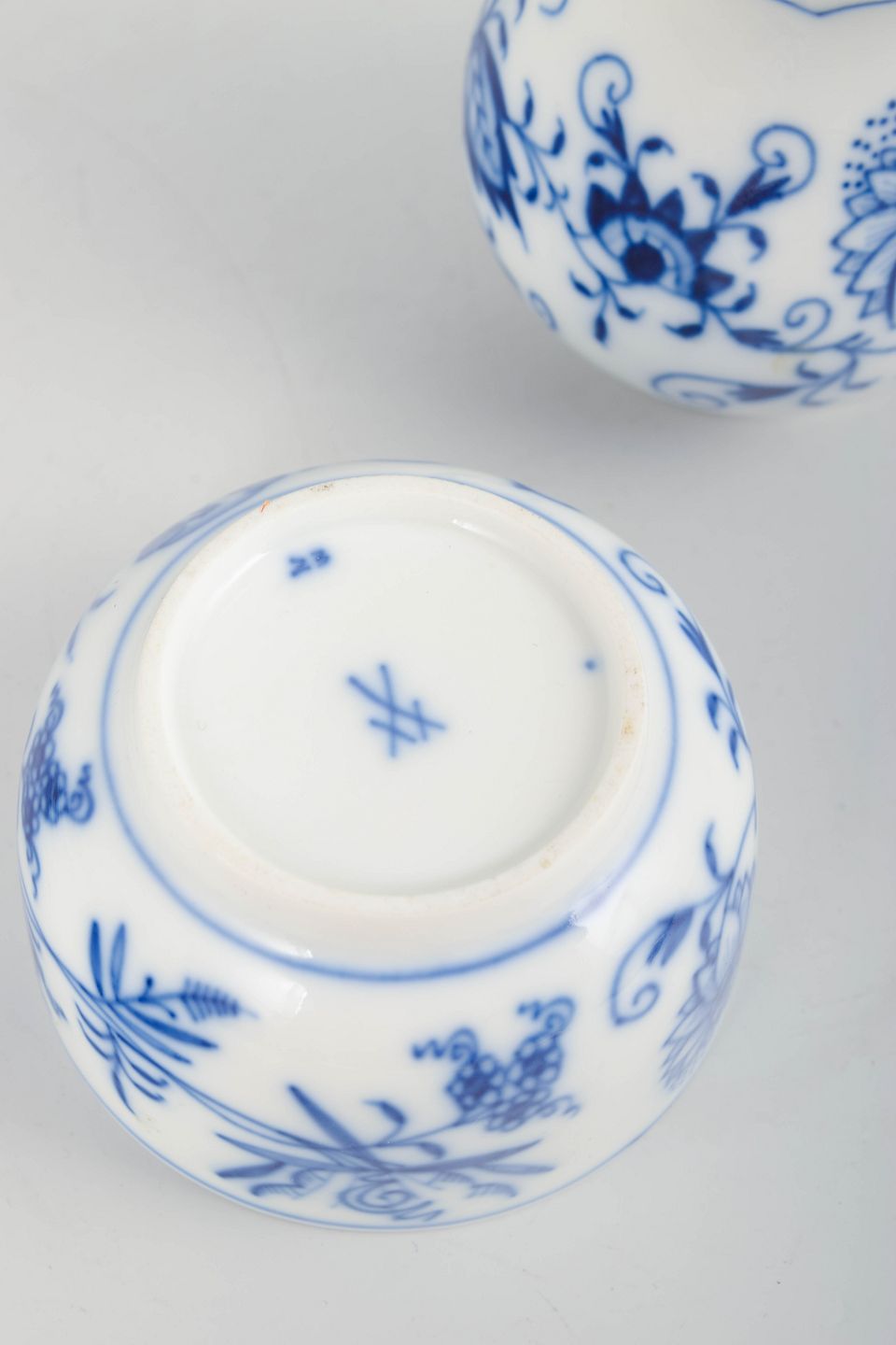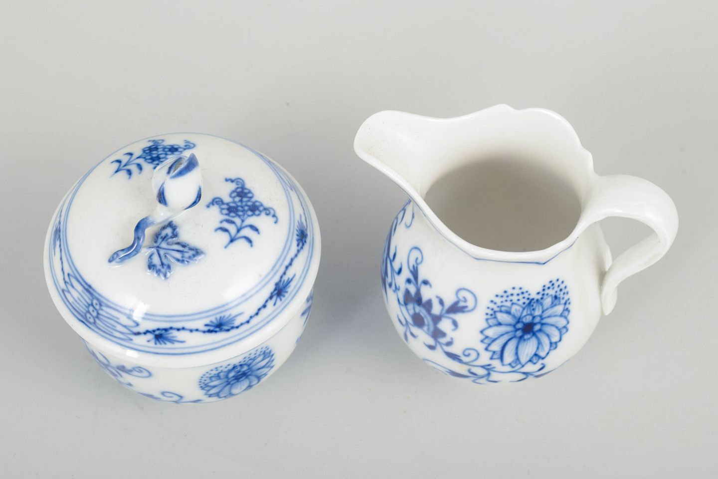 Meissen Blue Onion pattern sugar bowl and cream jug, mid-20th century.
