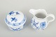 Et sæt bestående af en klassisk sukkerskål med låg og en flødekande i det ikoniske løgmønstret, håndmalet i koboltblå underglasur.