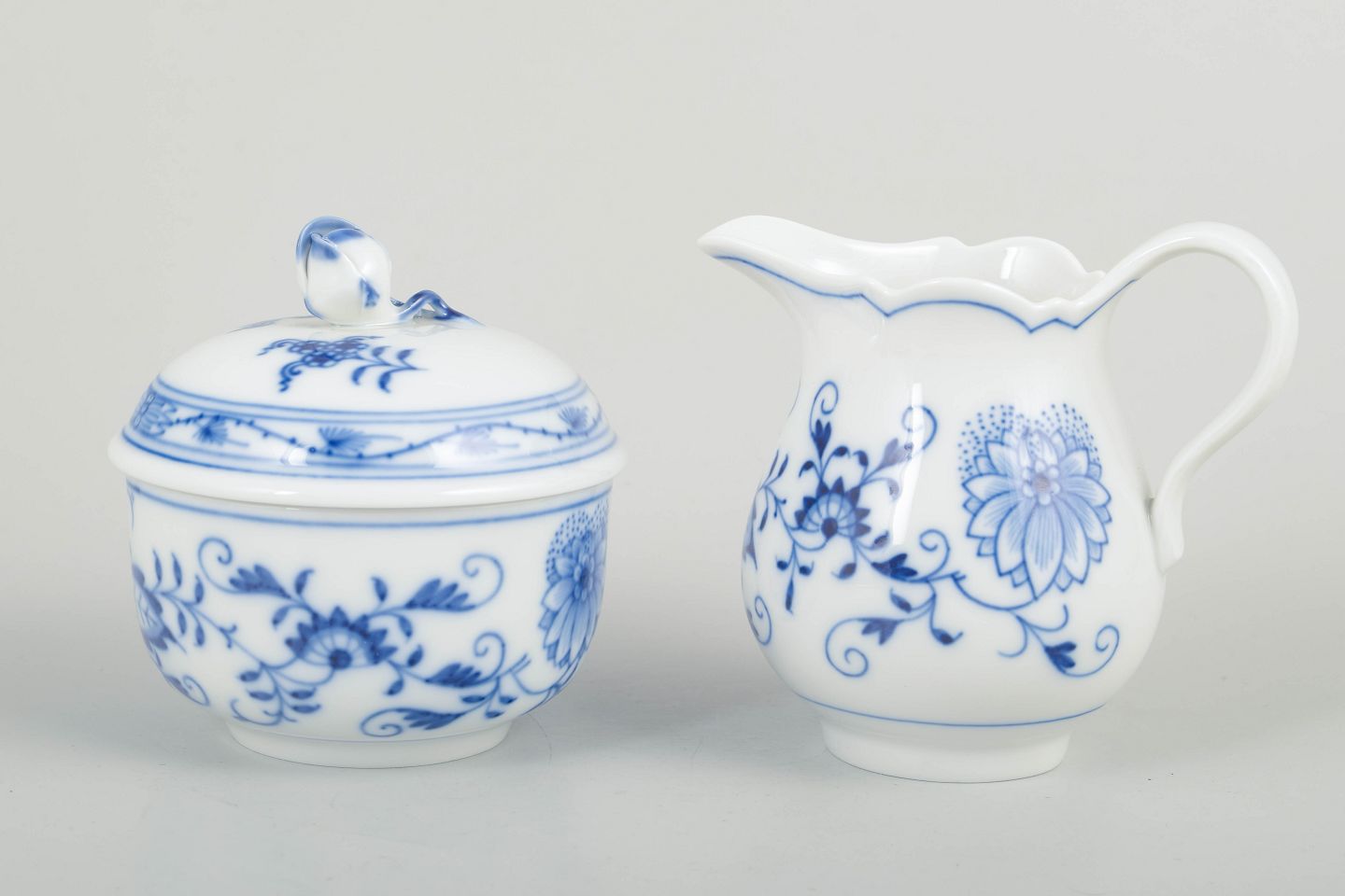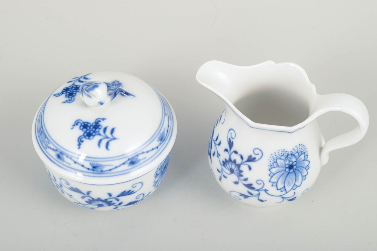 Meissen løgmønstret sukkerskål og flødekande.