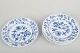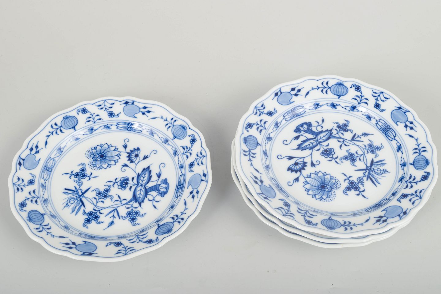Set of four Meissen plates in the classic Zwiebelmuster (Blue Onion) pattern, hand-painted in cobalt-blue underglaze with a scalloped rim. An elegant late 20th-century set.