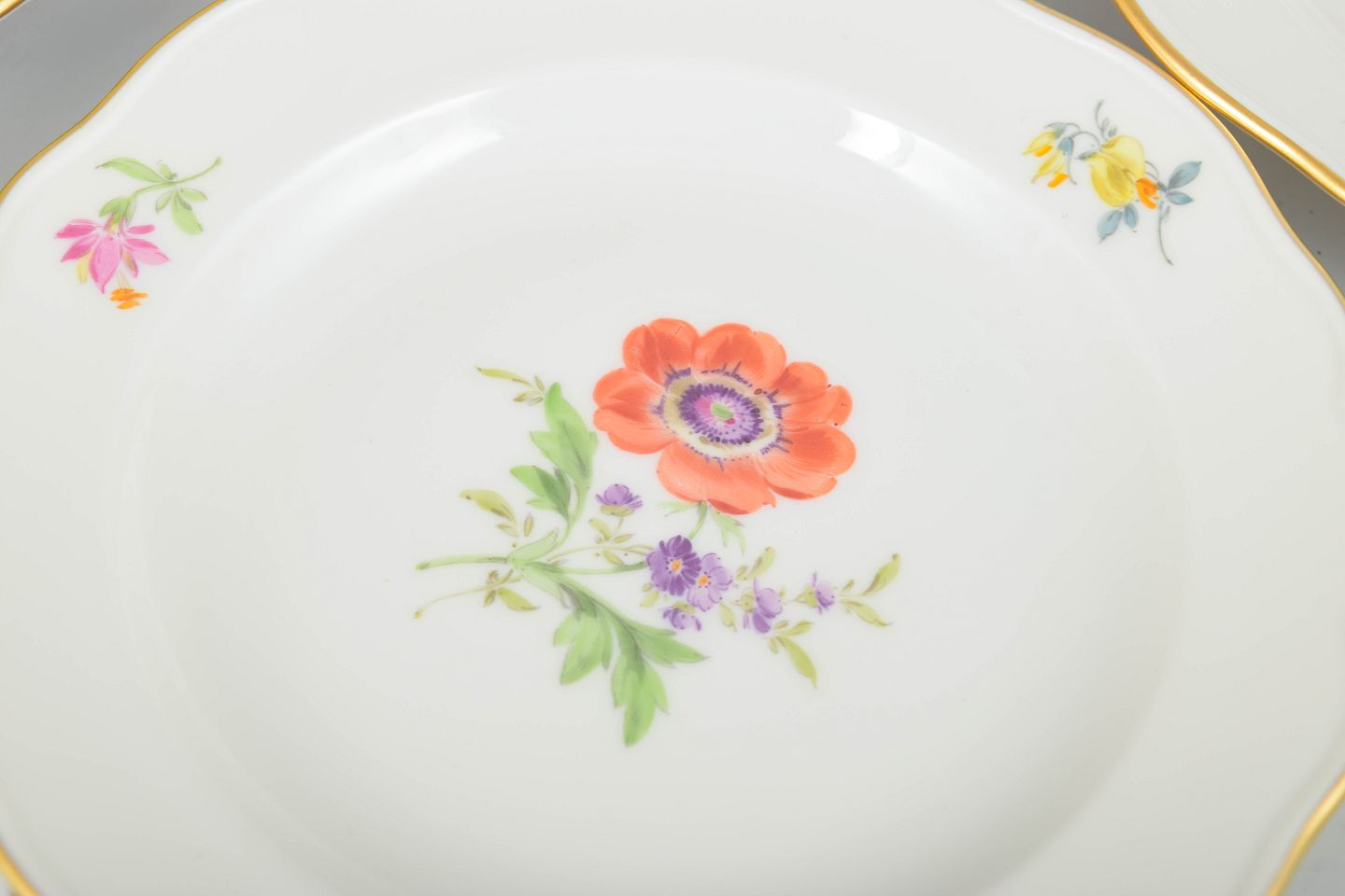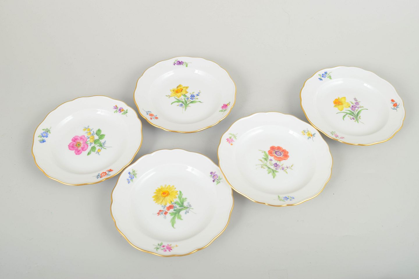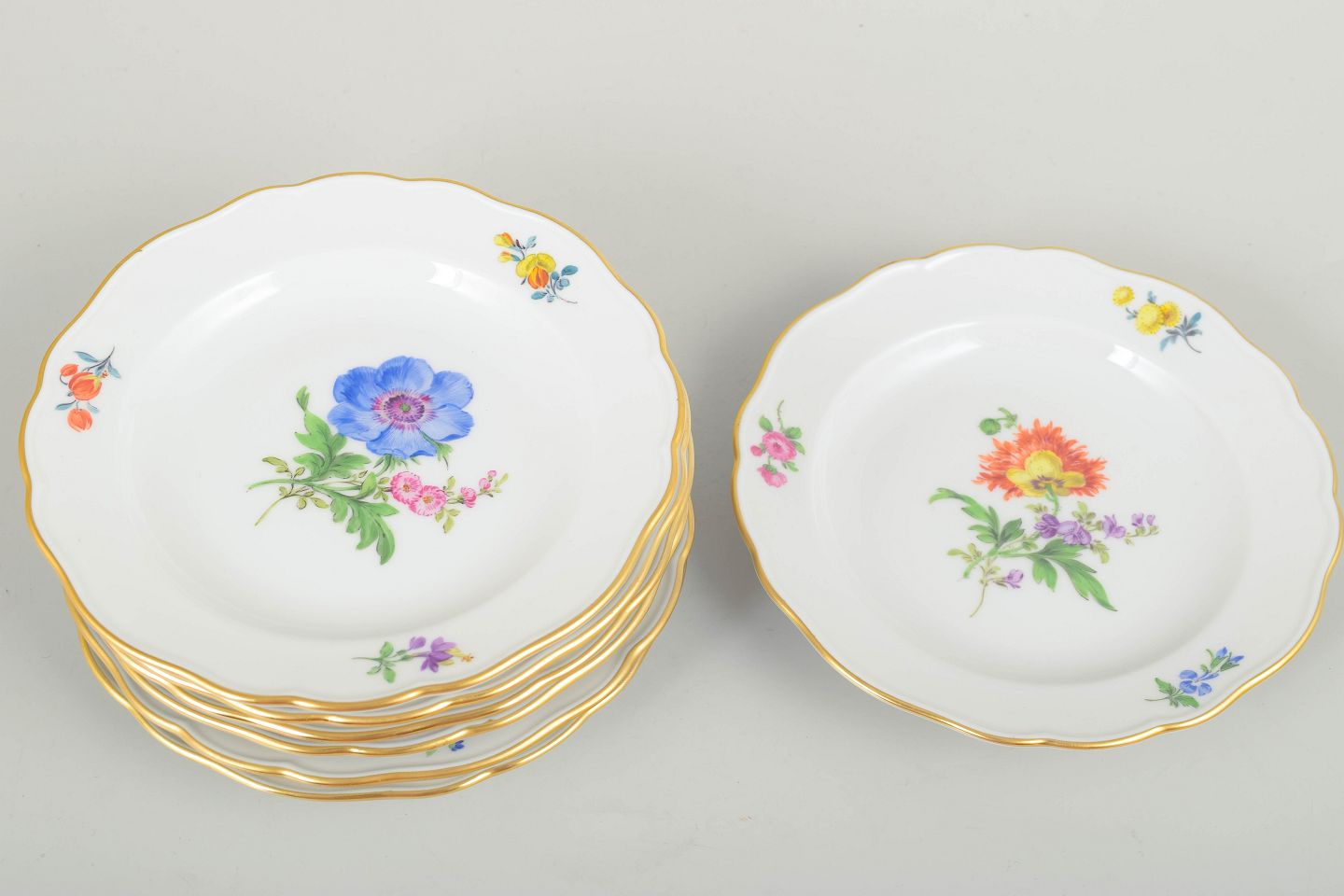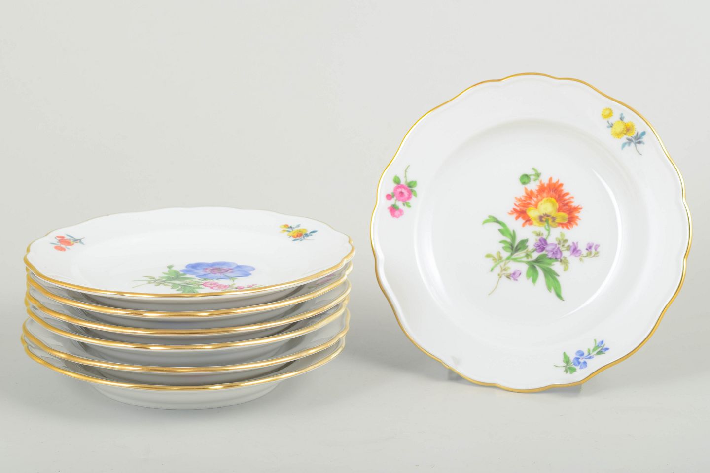 Set of seven Meissen porcelain side plates with hand-painted polychrome floral motifs and fine gilt edging. Classic scalloped forms in traditional Meissen style.