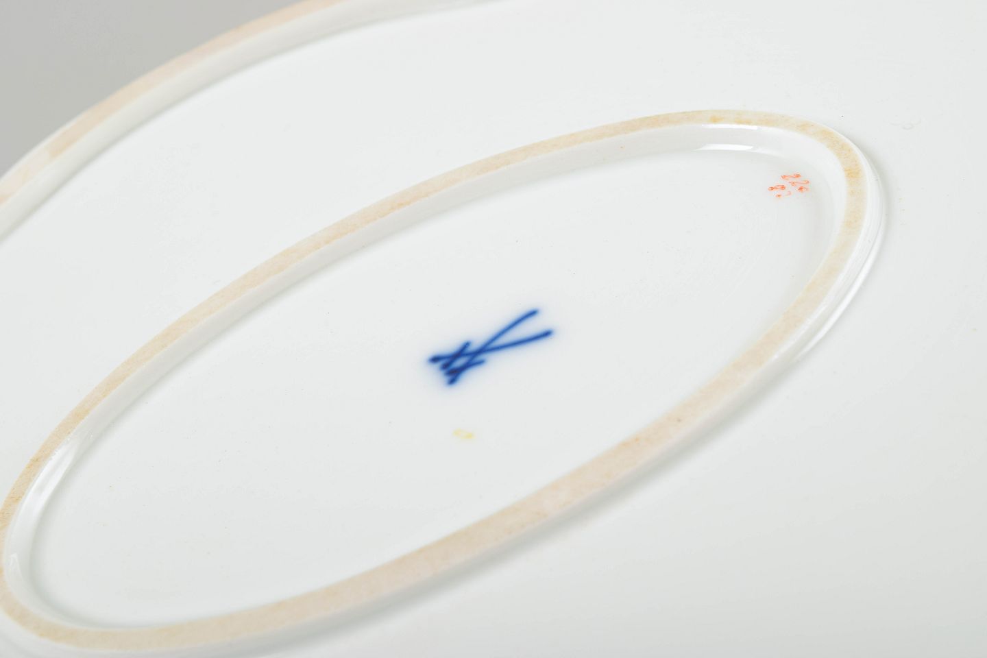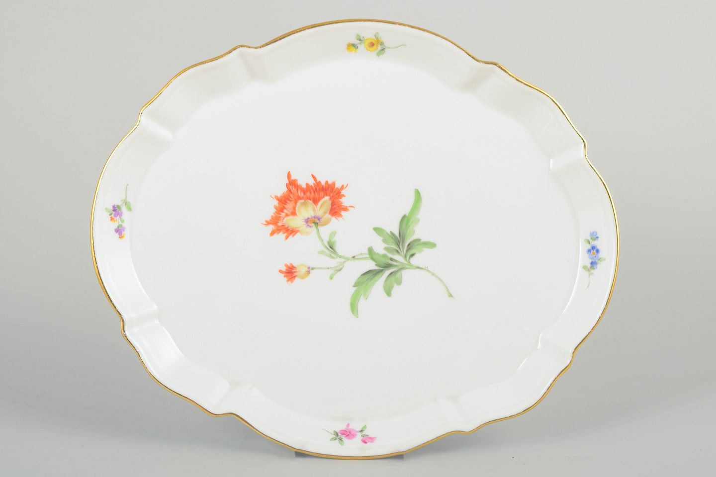 Oval Meissen-porcelænsbakke med håndmalet blomstermotiv i polykrome farver og fin guldkant. Smukt profileret og svunget rand.