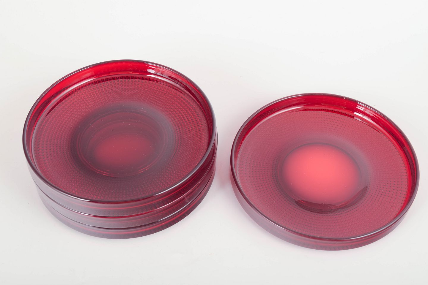 Sæt med fire flade tallerkener i rubinrødt glas fra Gullaskruf, model “Vineta”, karakteriseret ved den optiske prikketekstur og dybe, klare farve. Et markant og elegant eksempel på svensk glasdesign fra perioden.