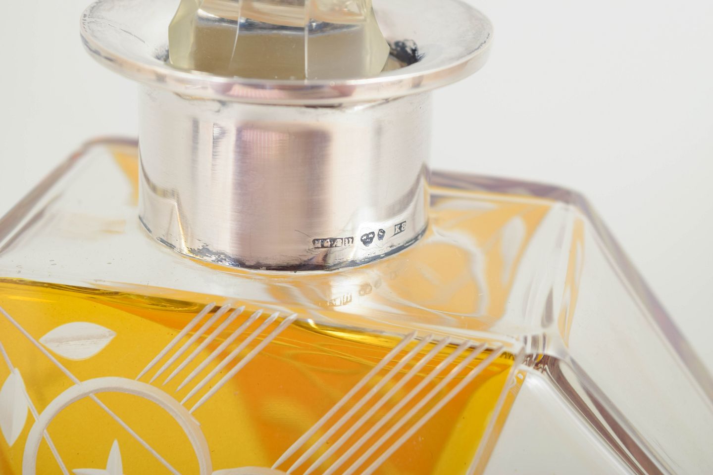 Facetteret Art Deco-karaffel i slebet og dekoreret krystalglas med orange/guldtonet krystalglasur og geometriske ornamenter. Original facetteret prop og sølvmontering.