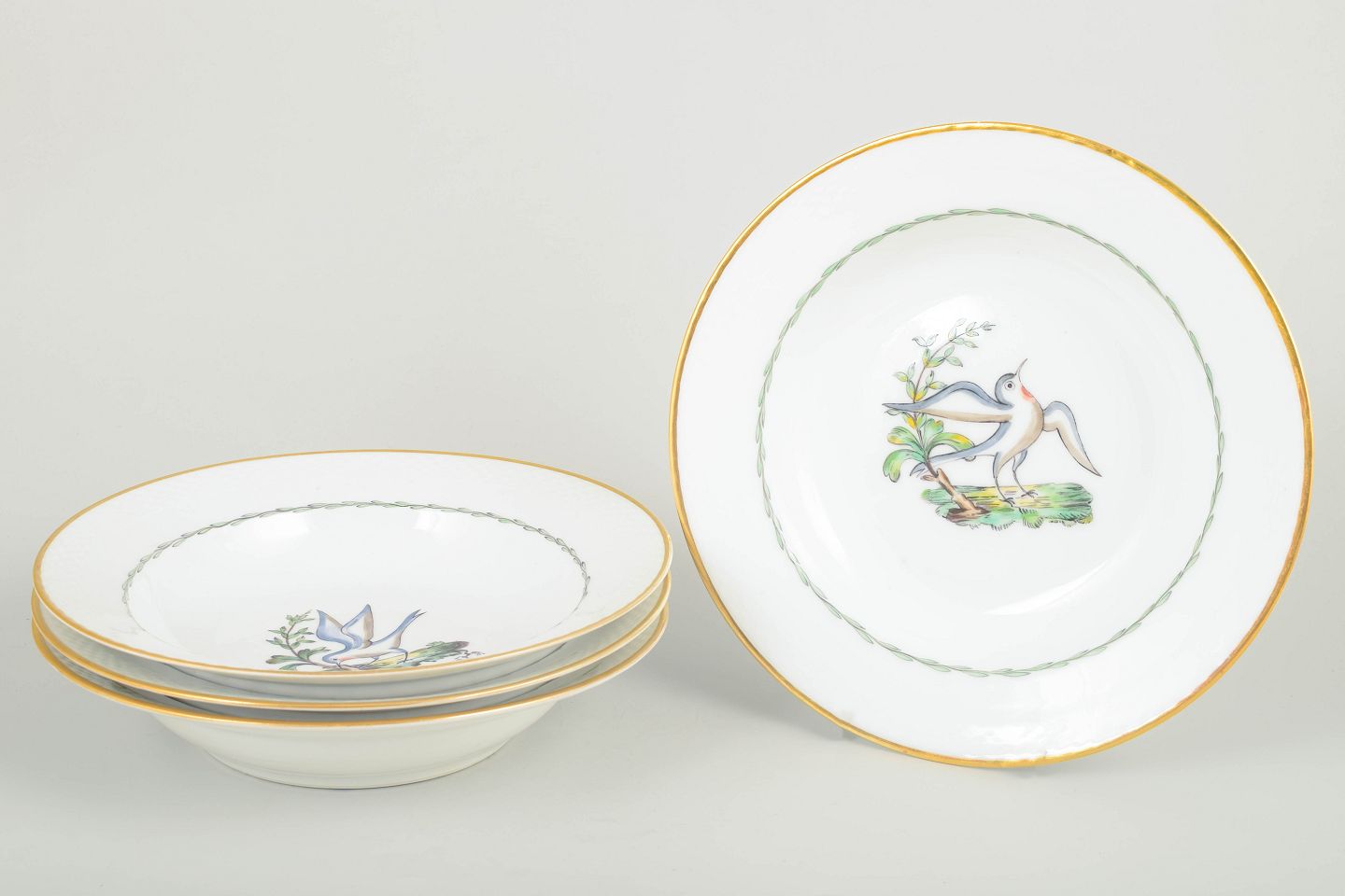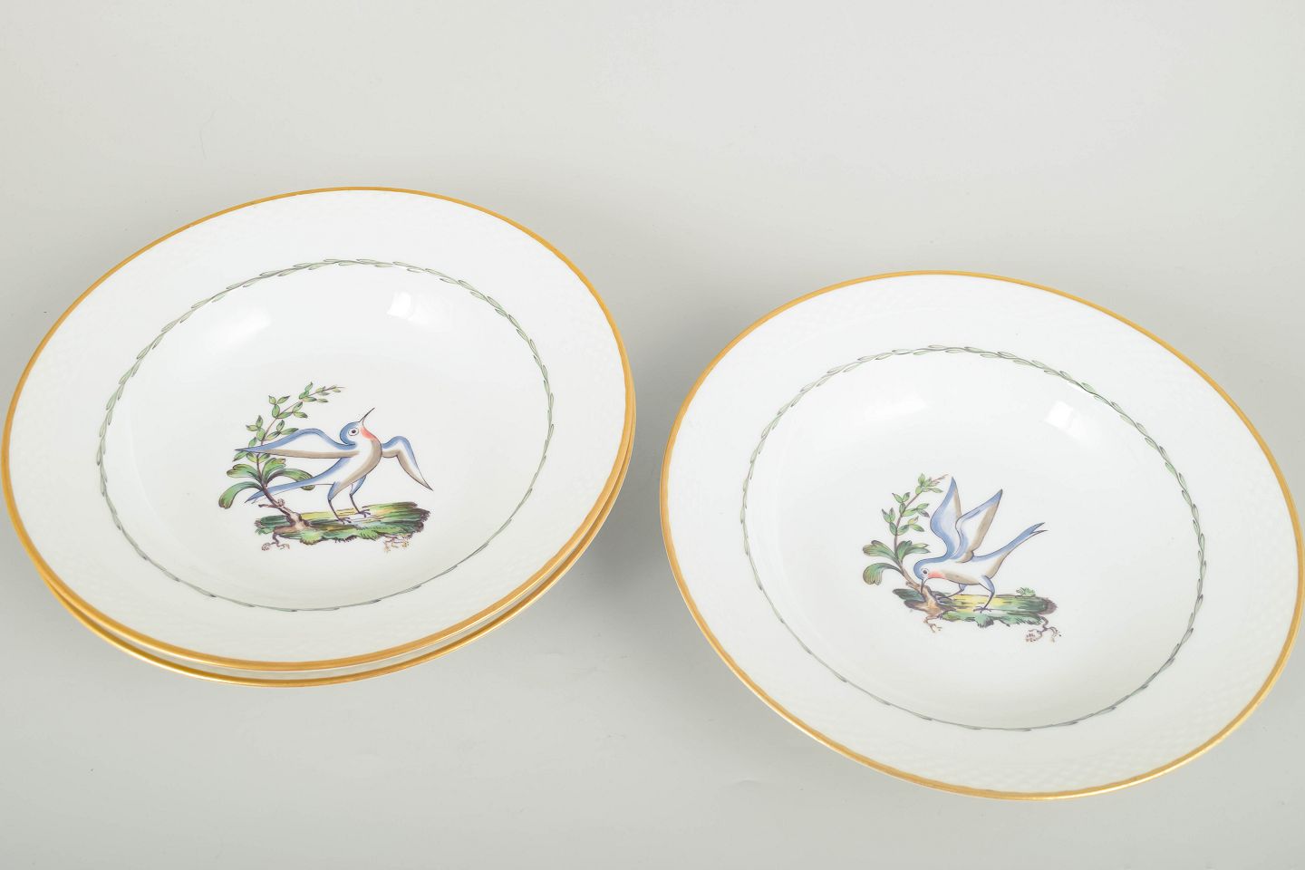 Sjældne dybe tallerkener i porcelæn fra Royal Copenhagen med motiv af fugle og botaniske elementer (model 550/8107). Hver tallerken er kantet med guldrand og har et elegant, let riflet fletrelief langs kanten.