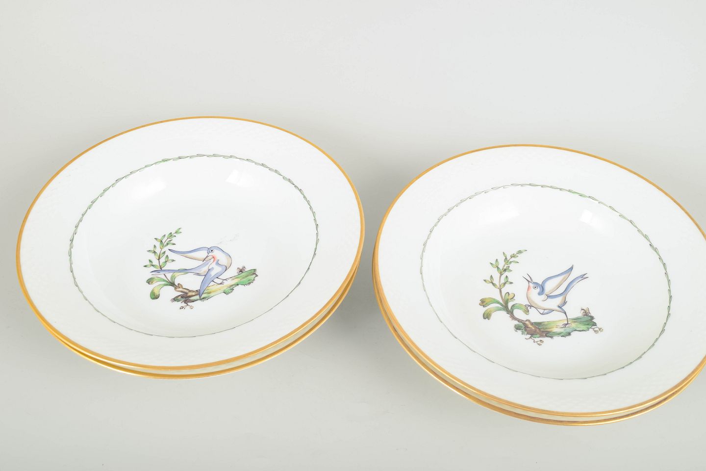 Sjældne dybe tallerkener i porcelæn fra Royal Copenhagen med motiv af fugle og botaniske elementer (model 550/8107). Hver tallerken er kantet med guldrand og har et elegant, let riflet fletrelief langs kanten.