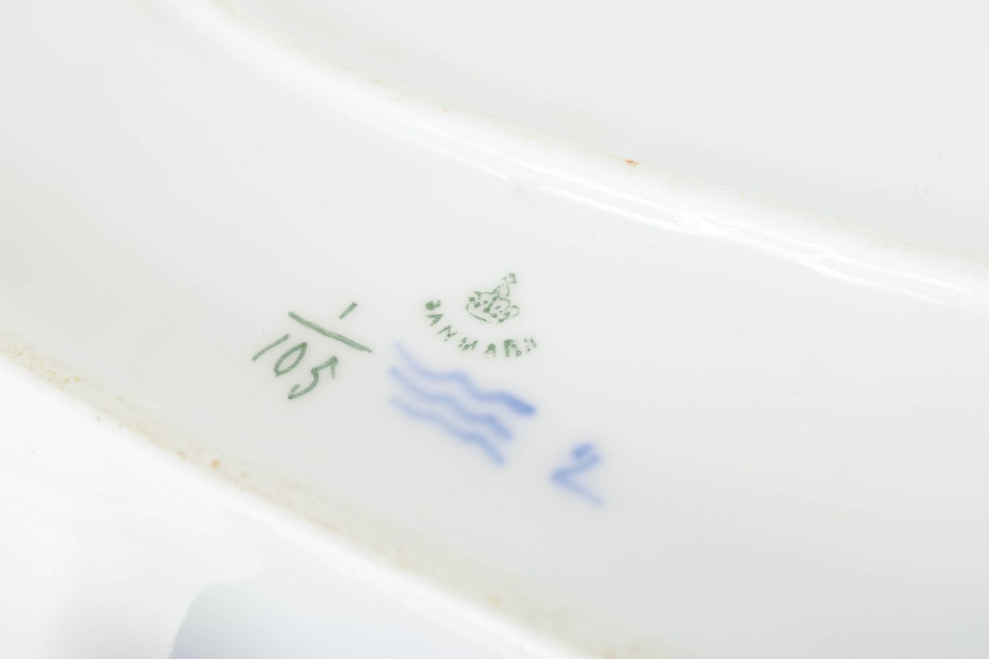 Stort og elegant fiskefad i klassisk musselmalet riflet porcelæn med håndmalet blå dekoration og riflet korpus. Den aflange form og det rige mønster gør fadet til et markant og dekorativt serveringsstykke fra begyndelsen af det 20. århundrede.