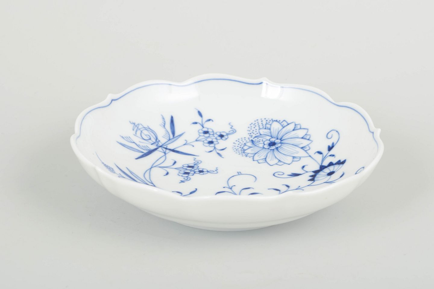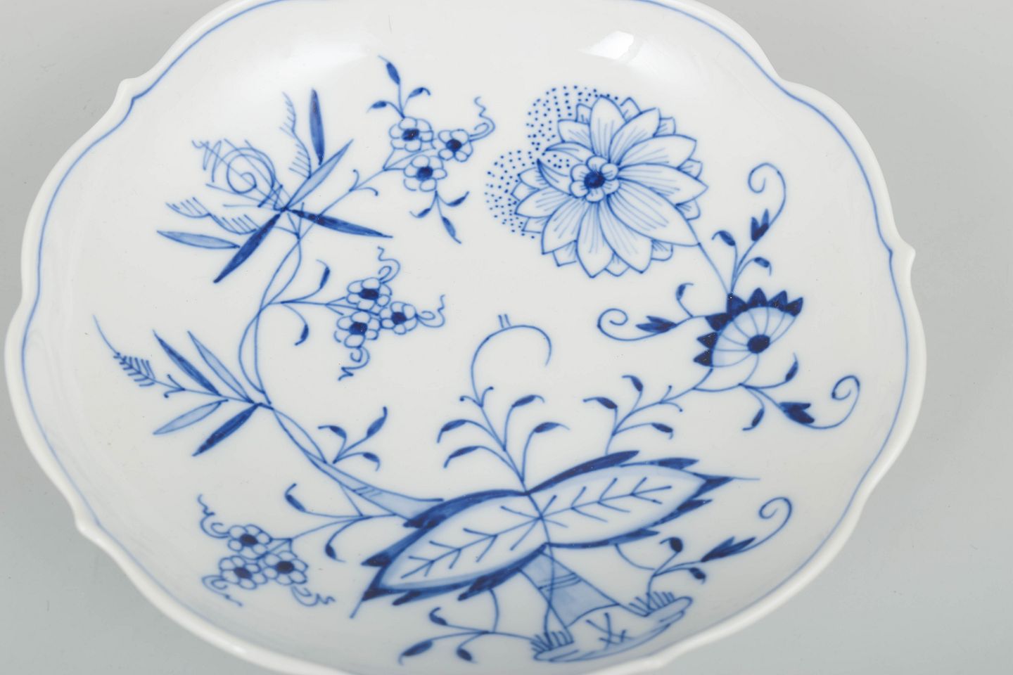 Håndmalet Meissen “løgmønstret” (Zwiebelmuster) skål i første sortering. Klassisk bølget kant og dyb koboltblå dekoration, udført i porcelæn af høj kvalitet.