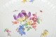 Elegant sæt håndmalede tallerkener i hvidt porcelæn med farverige blomsterbuketter, små spredte blomster og profileret reliefkant med guldbort. Klassisk Meissen-arbejde af høj kvalitet.