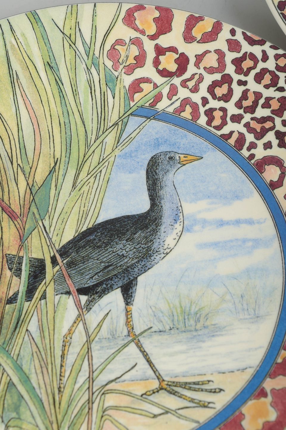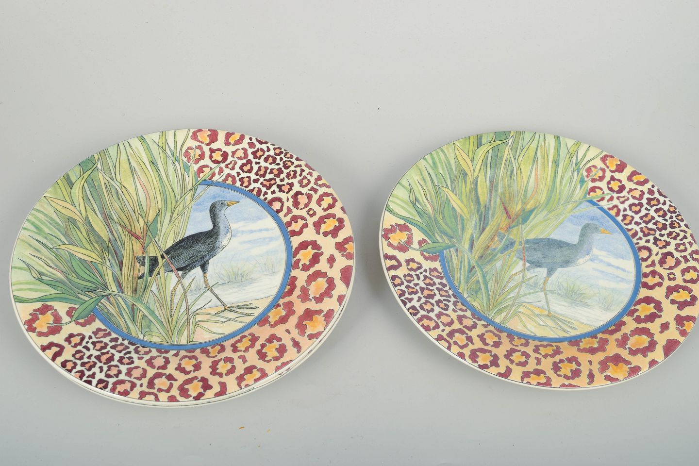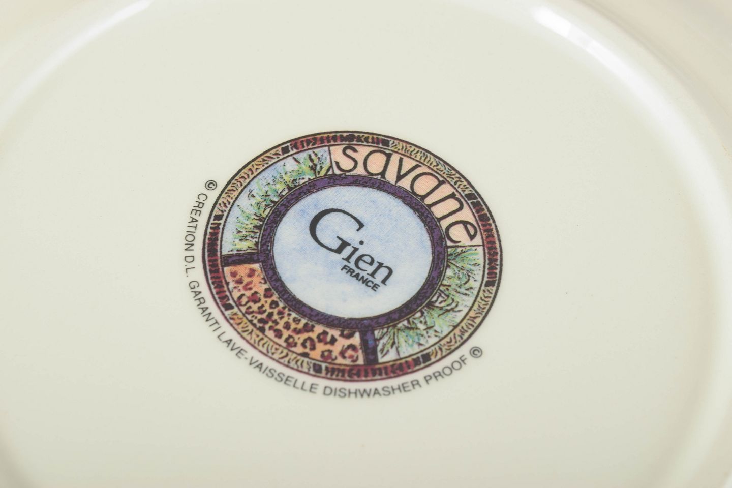 Decorative faience plates by Gien in the vibrant “Savane” pattern featuring a naturalistic animal motif and colourful border. A characteristic example of the factory’s artistic decoration of the 1980s.