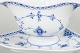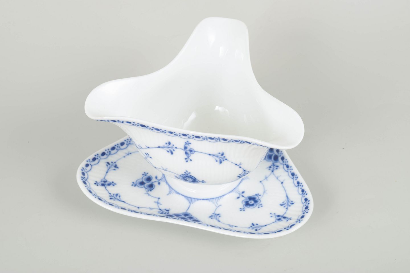 Elegant sauce boat in the Blue Fluted Half Lace pattern, model 1/586, with integrated tray. Classic hand-painted cobalt blue decoration on white porcelain in Royal Copenhagen’s early 20th-century style. A fine example of the series’ delicate lace details and organic form.