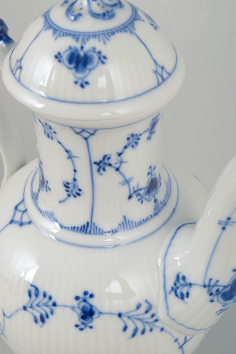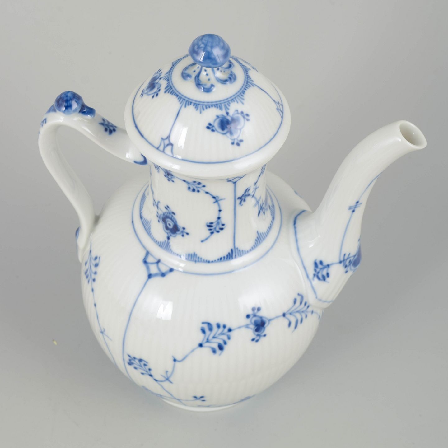 Elegant kaffekande i det klassiske Musselmalet Riflet-mønster, model 1/48. Håndmalet dekor med fine blå detaljer og riflet korpus.