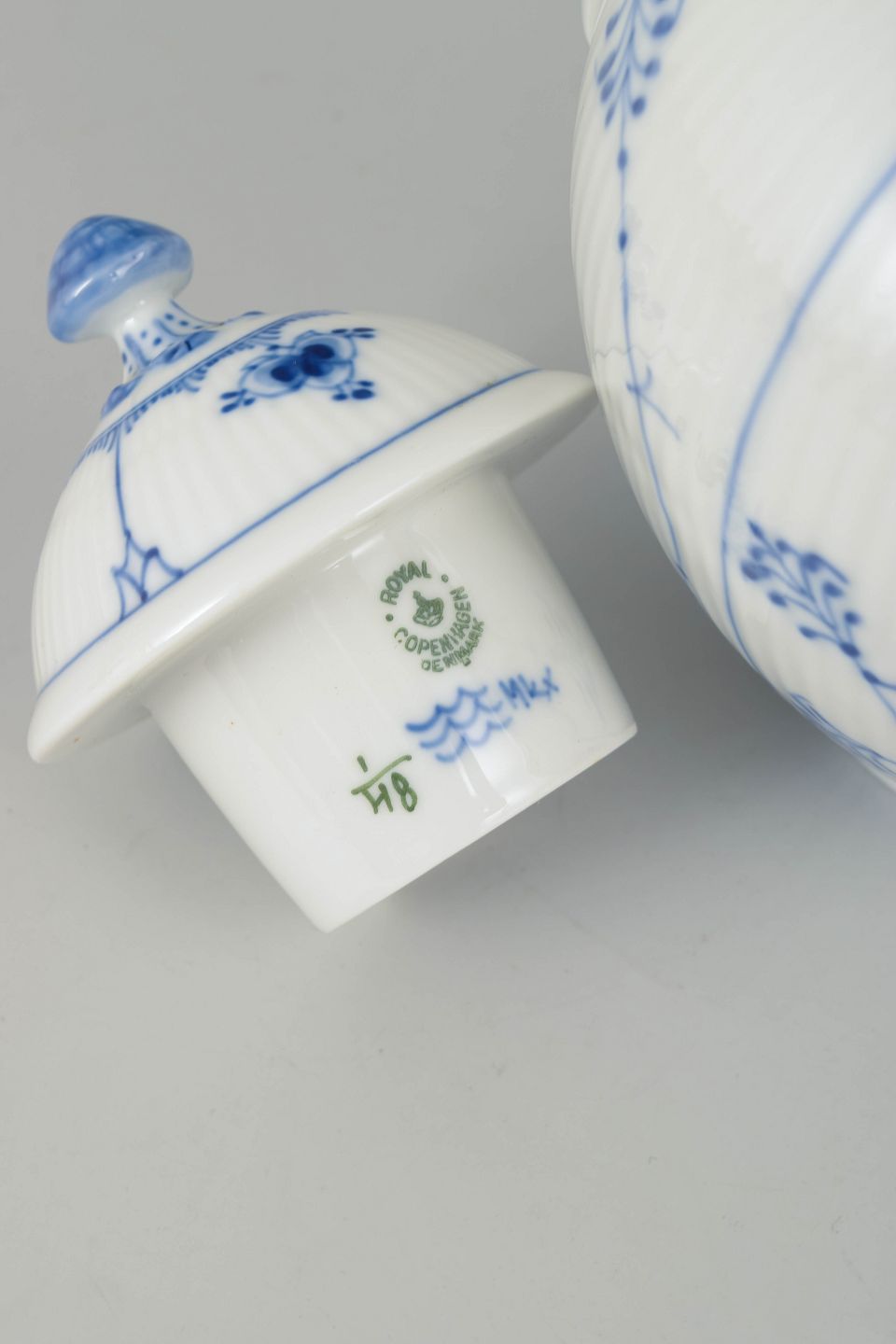 Musselmalet Riflet blev introduceret af Royal Copenhagen i 1775 og er fortsat et ikon inden for dansk porcelænskunst. Hvert stykke håndmales efter traditionen, hvilket giver subtile variationer og en unik karakter. Stellet er internationalt anerkendt for sin kvalitet, håndværk og tidløse skønhed.