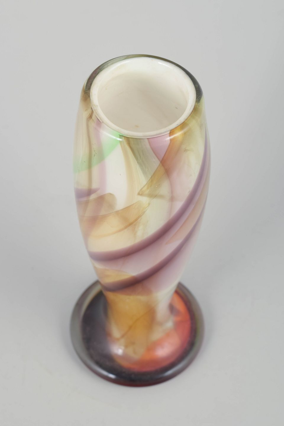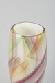 Mundblæst glasvase fra den dekorative Cascade serie, med bløde, spiralformede farvebånd i rosa, rav, grønne og violette nuancer. Formen er elegant opadstræbende med let udvidet fod.