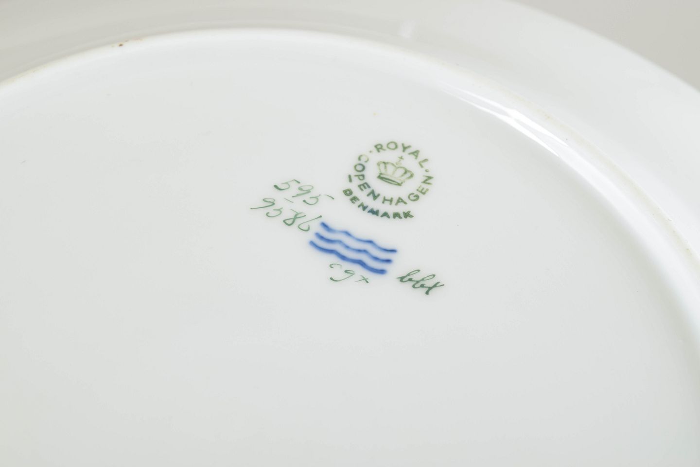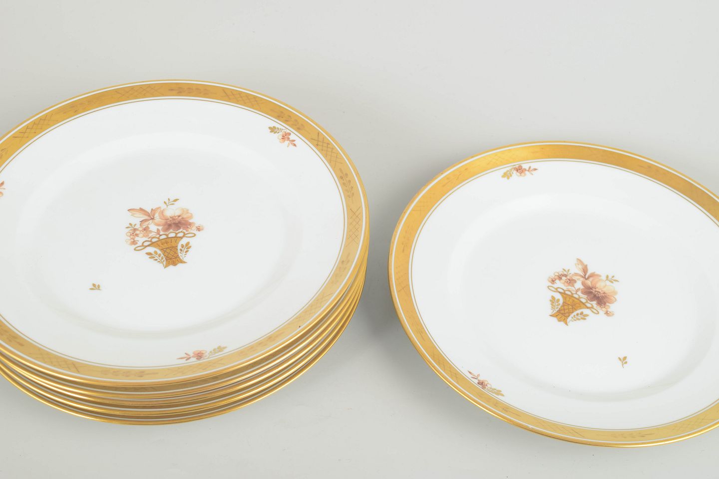 Sæt med seks elegante middagstallerkener i porcelæn fra Royal Copenhagens “Guldkurv”-serie, model 595/9586. Klassisk hvid porcelæn med bred forgyldt kant og håndmalet blomsterkurvmotiv.