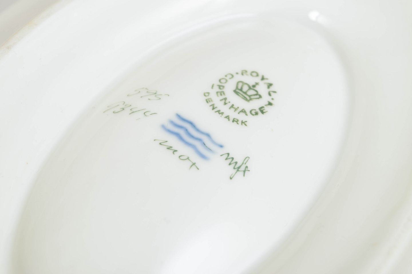 Elegant porcelain sauce boat from Royal Copenhagen’s “Golden Basket” series, model 595/9344. Features an attached underplate, gilded rim and the classic hand-painted floral basket motif.
