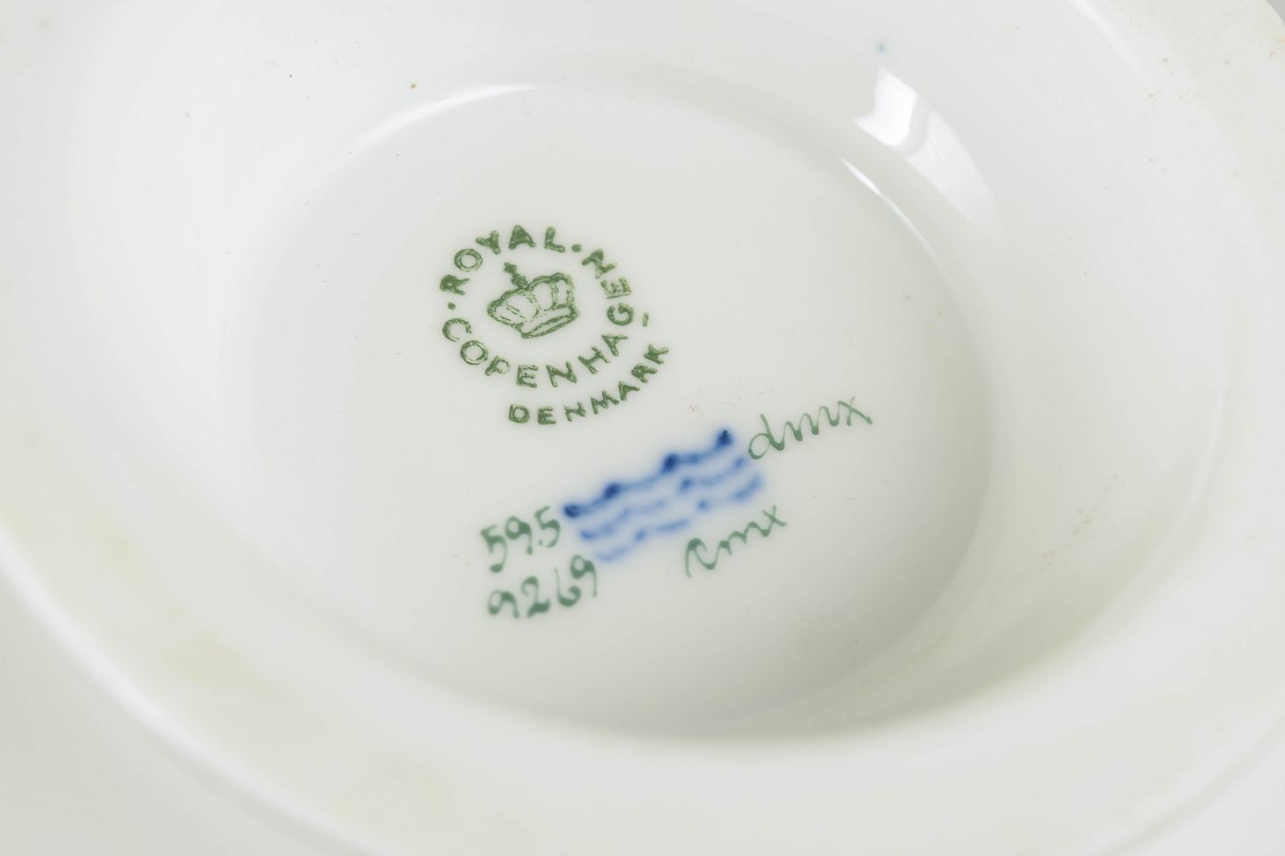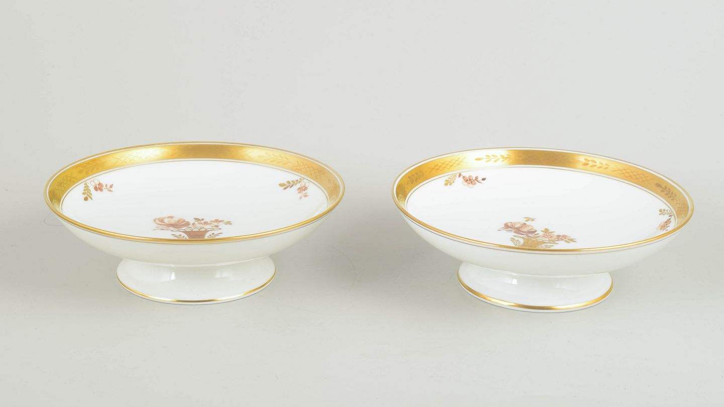 par opsatser i porcelæn fra Royal Copenhagens “Guldkurv”-serie, model 595/9269. Begge udført med forhøjet fod, bred forgyldt kant og håndmalet blomsterkurvmotiv.