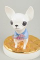 Decorative porcelain figure depicting a chihuahua, executed in glossy glazed porcelain with painted decoration and an applied bow set with rhinestones. The figure stands on a cushion-shaped base with a gold-coloured surface. Produced by Goebel in a limited edition of 100 pieces.