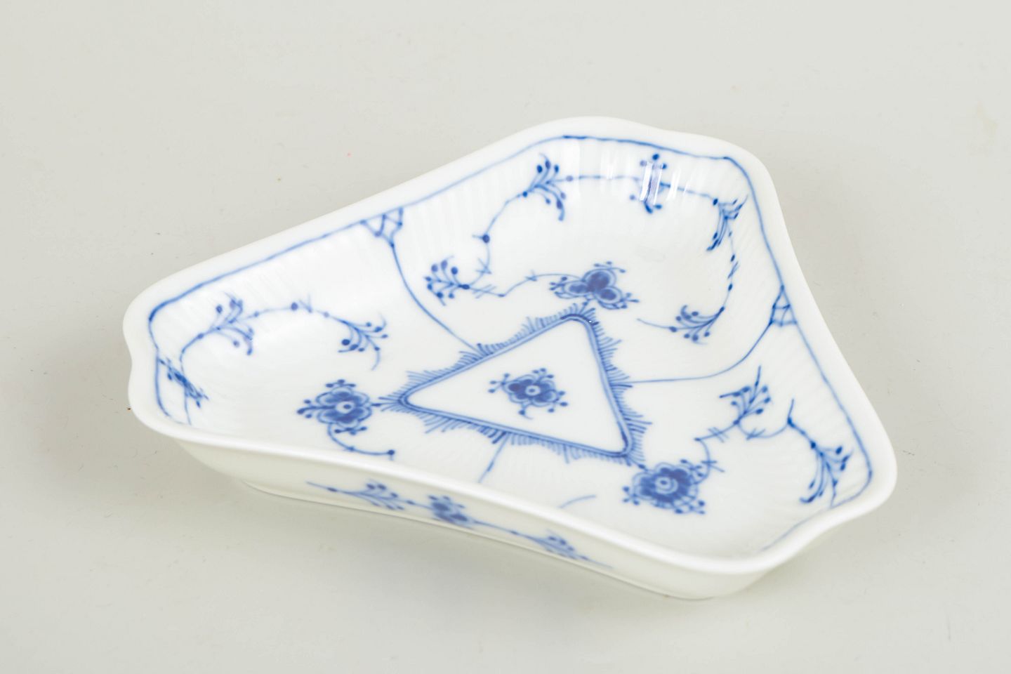 Royal Copenhagen Musselmalet Riflet trekantet asiet, 1960’erne.